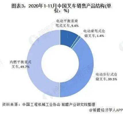 叉車主要分為四類,包括內(nèi)燃平衡重式叉車、電動(dòng)平衡重叉車、電動(dòng)乘駕式倉儲(chǔ)叉車、電動(dòng)步行式倉儲(chǔ)叉車,分別對應(yīng)歐美分類標(biāo)準(zhǔn)的IV/V、I、II、III類叉車。從2020年1-11月份的銷售結(jié)構(gòu)來看,內(nèi)燃平衡重式叉車和電動(dòng)步行式倉儲(chǔ)叉車占比最高,分別為49.7%和39.5%。
