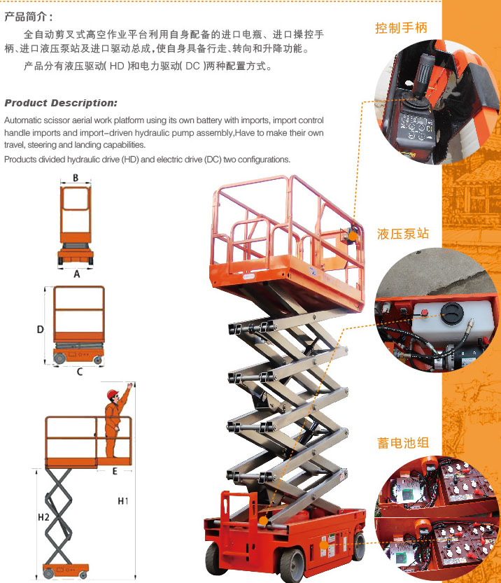 全自動剪叉式高空作業(yè)平臺利用自身配備的進口電瓶、進口操控手柄、進口液壓泵站及進口驅動總成,使自身具備行走、轉向和升降功能。