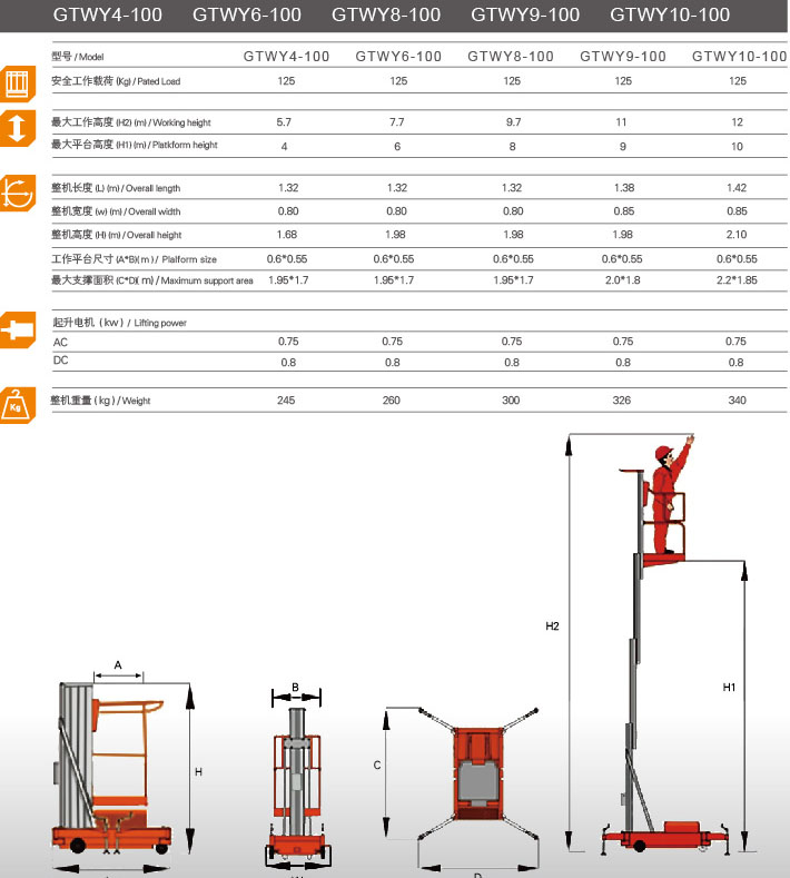 桅柱式升降平臺(tái)主體結(jié)構(gòu)采用新型高強(qiáng)度鋁合金型材制作,緊密配合,垂直升降,故高位作業(yè)時(shí)整機(jī)偏轉(zhuǎn)和擺性極小。具有造型美觀、體積小、重量輕、移動(dòng)方便、升降平穩(wěn)、安全可靠等優(yōu)點(diǎn)。